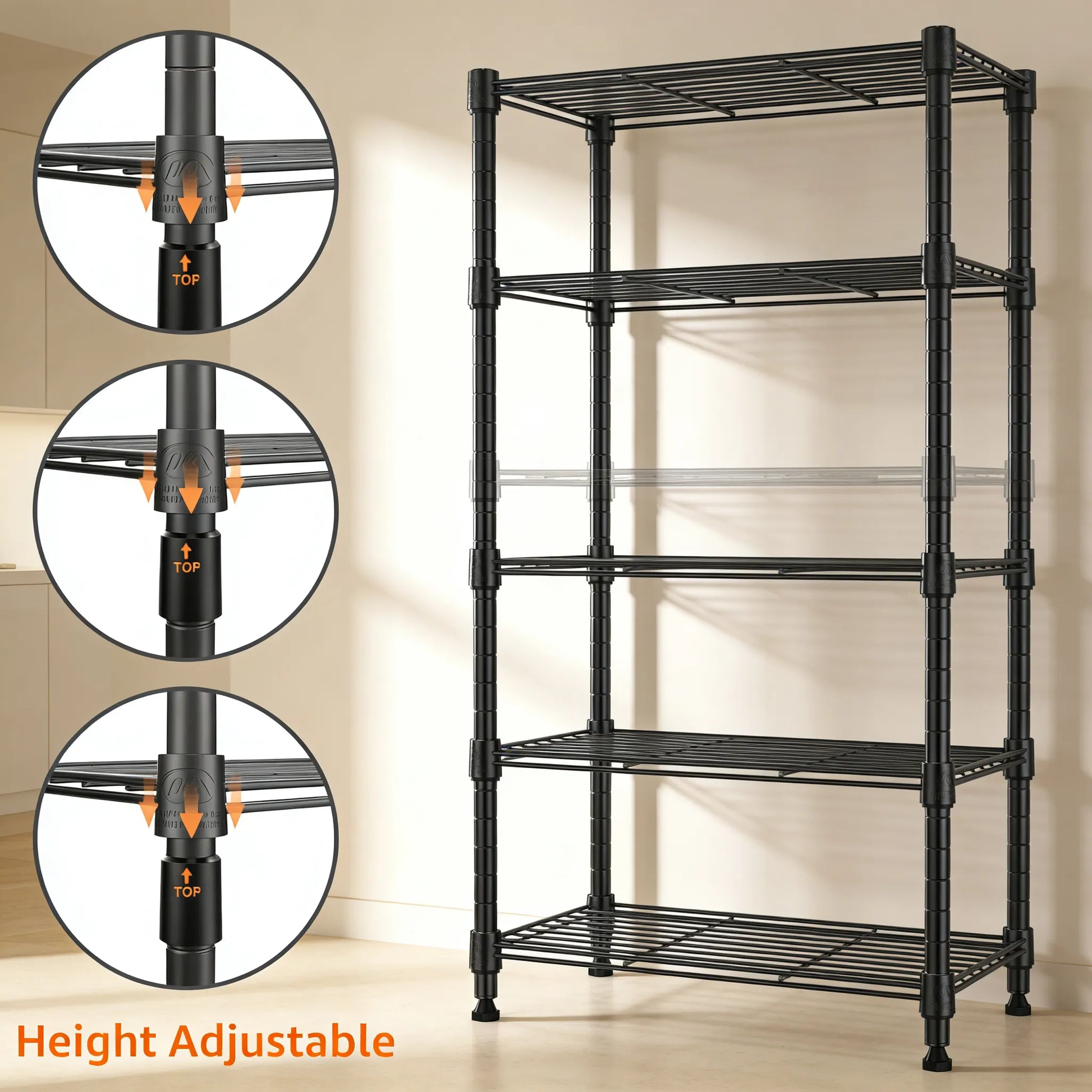 Adjustable Shelf Height – Easily customize the height of each shelf to fit items of different sizes according to your storage needs, offering flexibility and DIY convenience.
