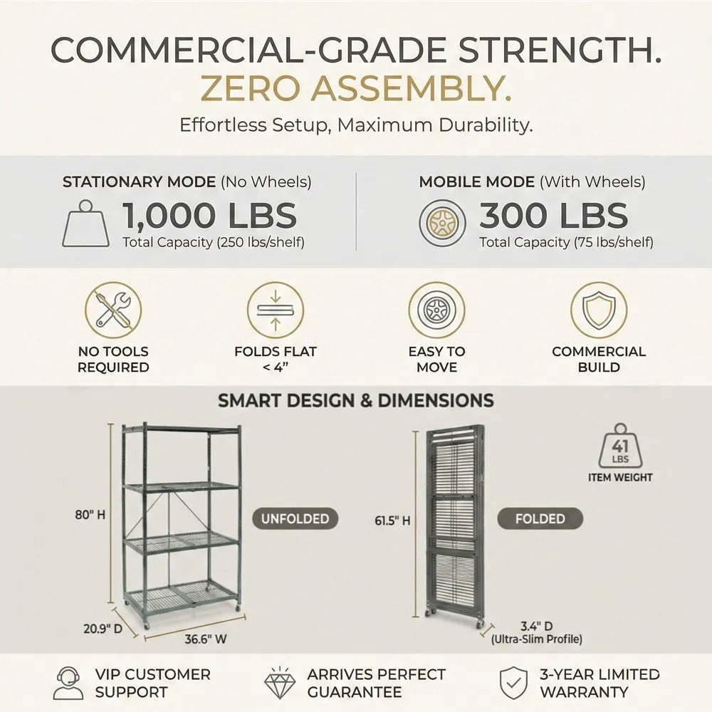 Just unfold, fill, and you're done. Each shelf holds up to 250 lbs—ideal for your pantry, garage, or office.